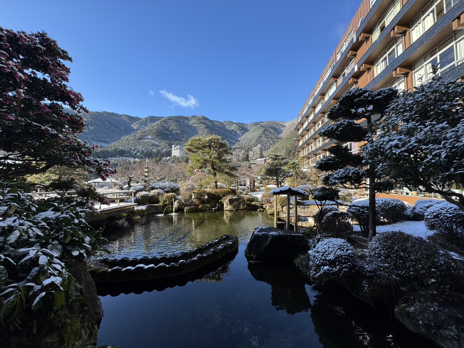 初雪の白と晴天の青、飛騨の山々と日本庭園(男性露天風呂)の草木の色。